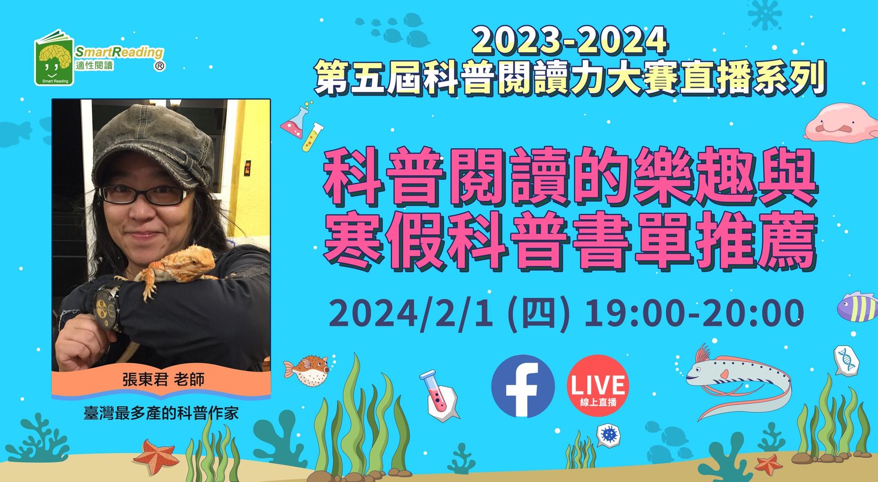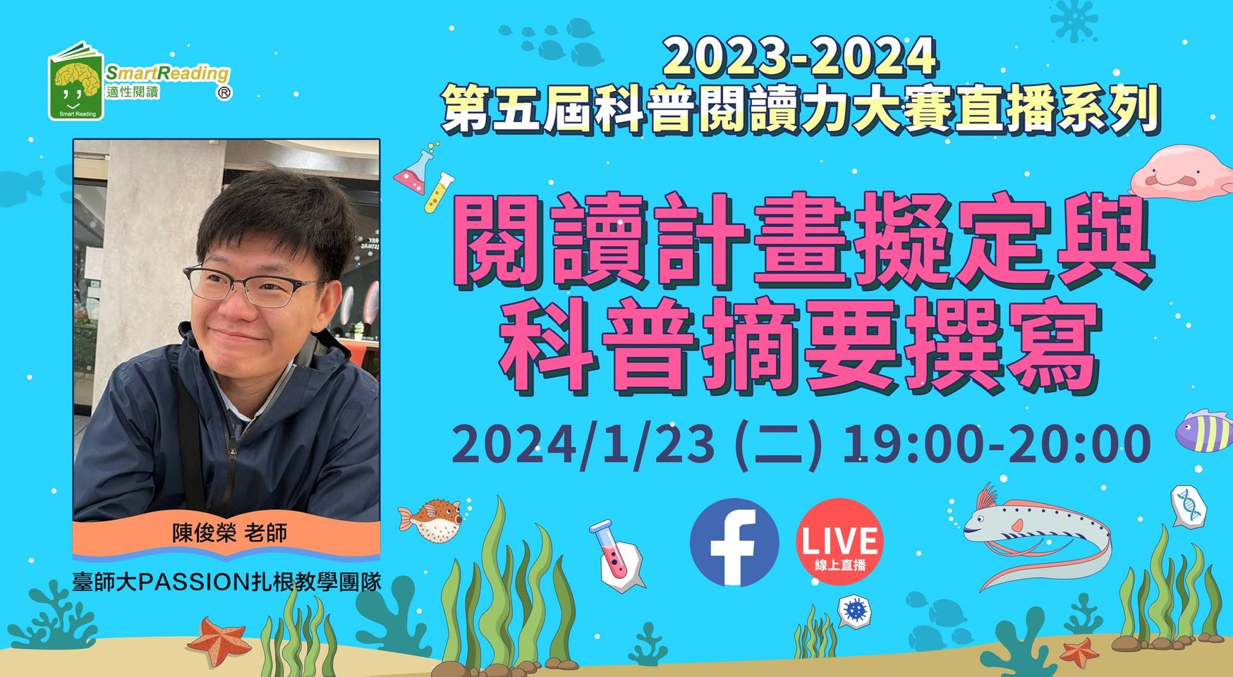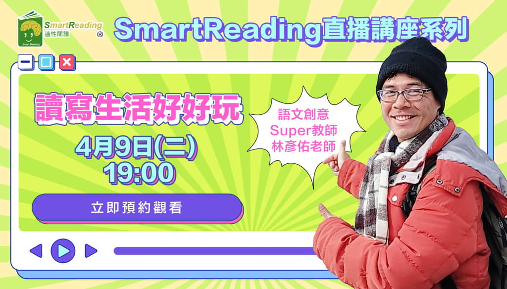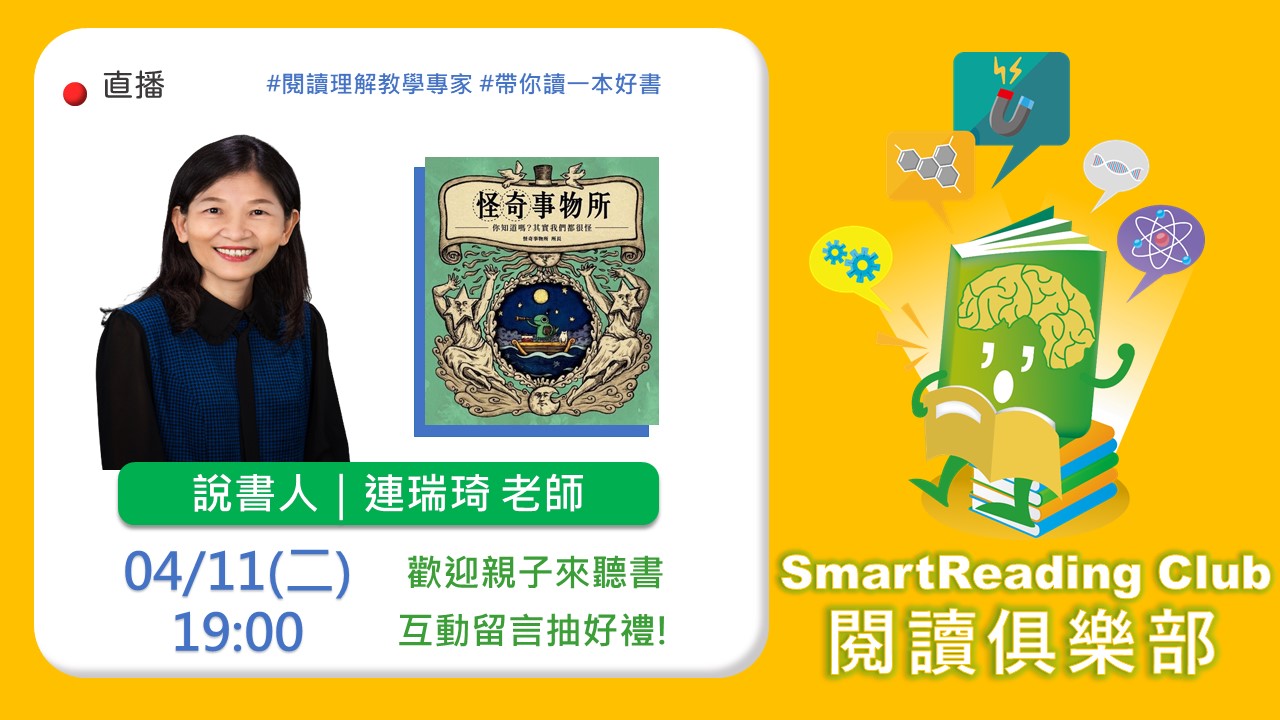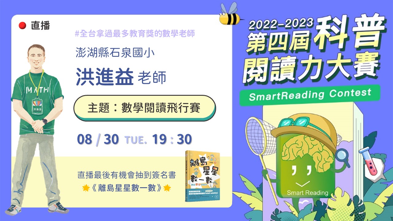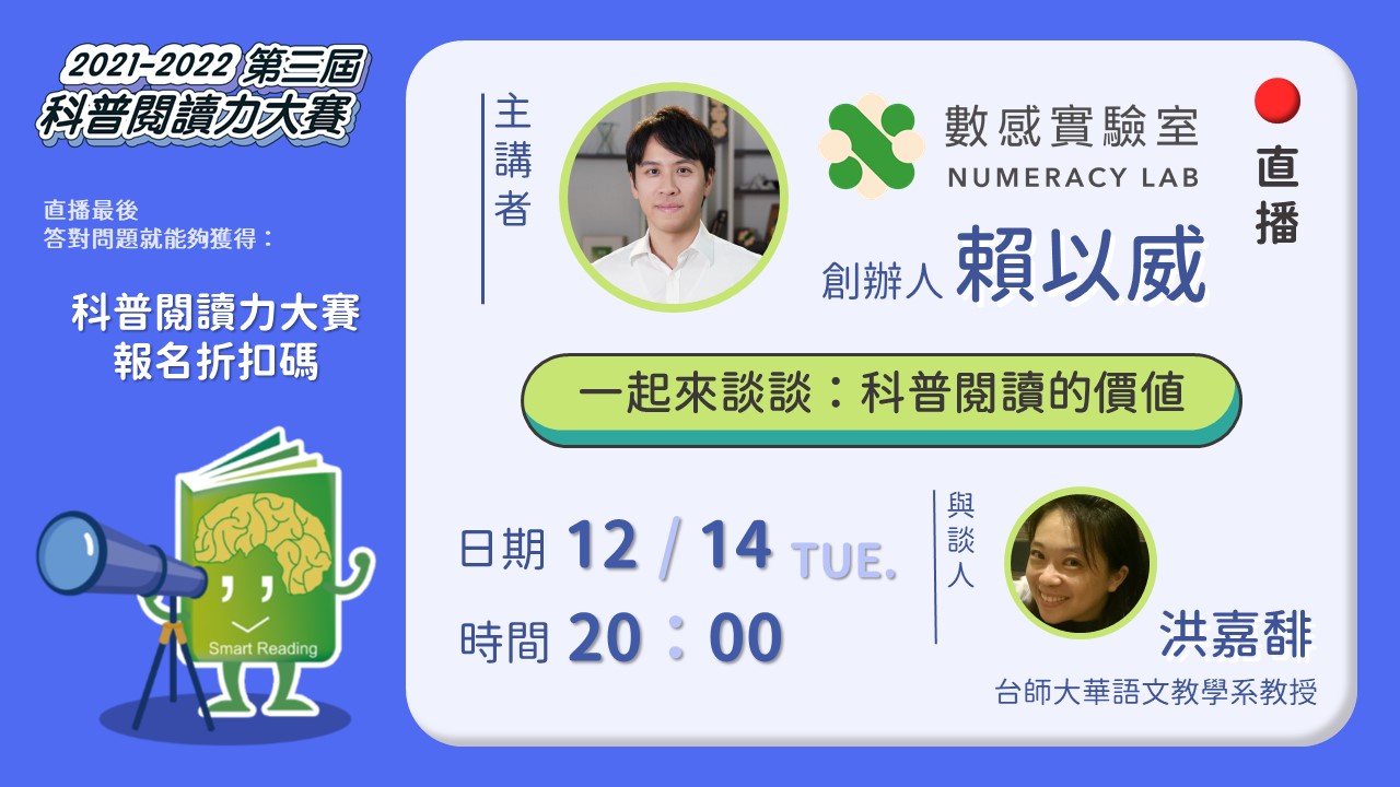 邀請到 數感實驗室 Numeracy Lab 創辦人賴以威老師以及SmartReading適性閱讀團隊的洪嘉馡教授,一起在直播中討論有關 科普閱讀的價值,以及以威老師在推廣科普閱讀上的故事!請各位家長同學們一起準時上線參與吧!