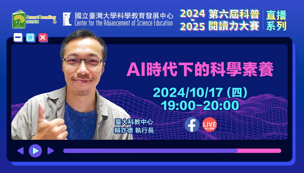 自第四屆科普賽開始,我們與 台大科學教育發展中心(CASE報科學)合作,收錄並分級推薦科普文章,深受好評!今年,我們再次攜手台大科教中心,帶來精彩的直播講座,邀請到 #賴亦德 執行長,與大家分享 「AI時代下的科學素養」