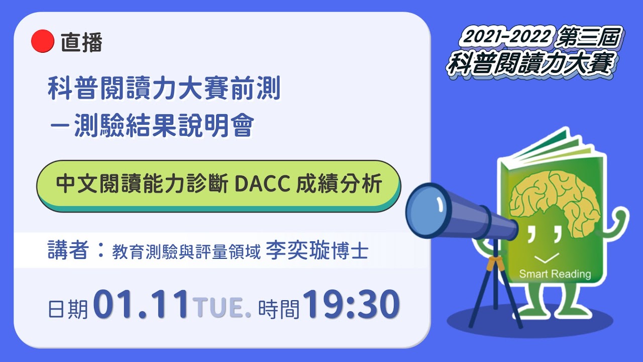 歡迎參賽學生、家長以及老師們一同上線聆聽,能夠更清楚了解如何透過中文閱讀能力診斷DACC的測驗結果,幫助學生了解自己的強項與弱項,並進一步增進閱讀能力...