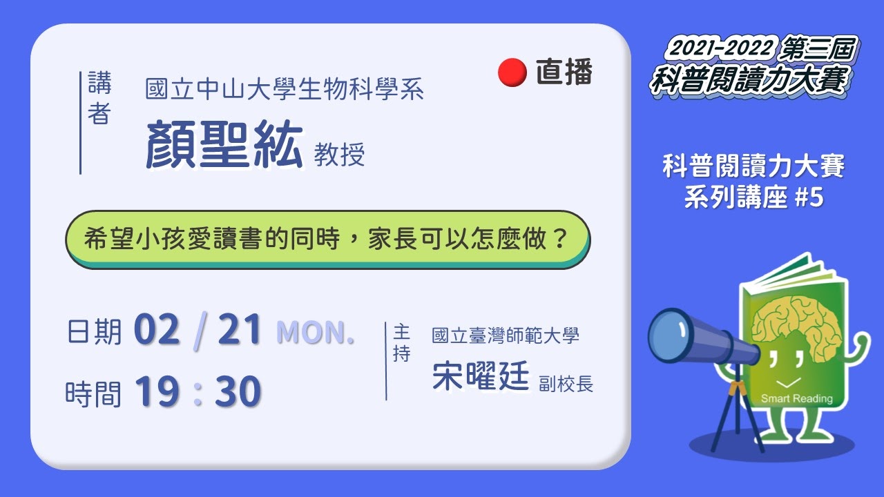 邀請到了中山大學生物科學系的顏聖紘教授,顏教授長期致力於科普、閱讀以及學生學習歷程之推廣教育,這次將跟我們分享,當家長希望小孩愛讀書的同時,可以做些什麼呢?...
