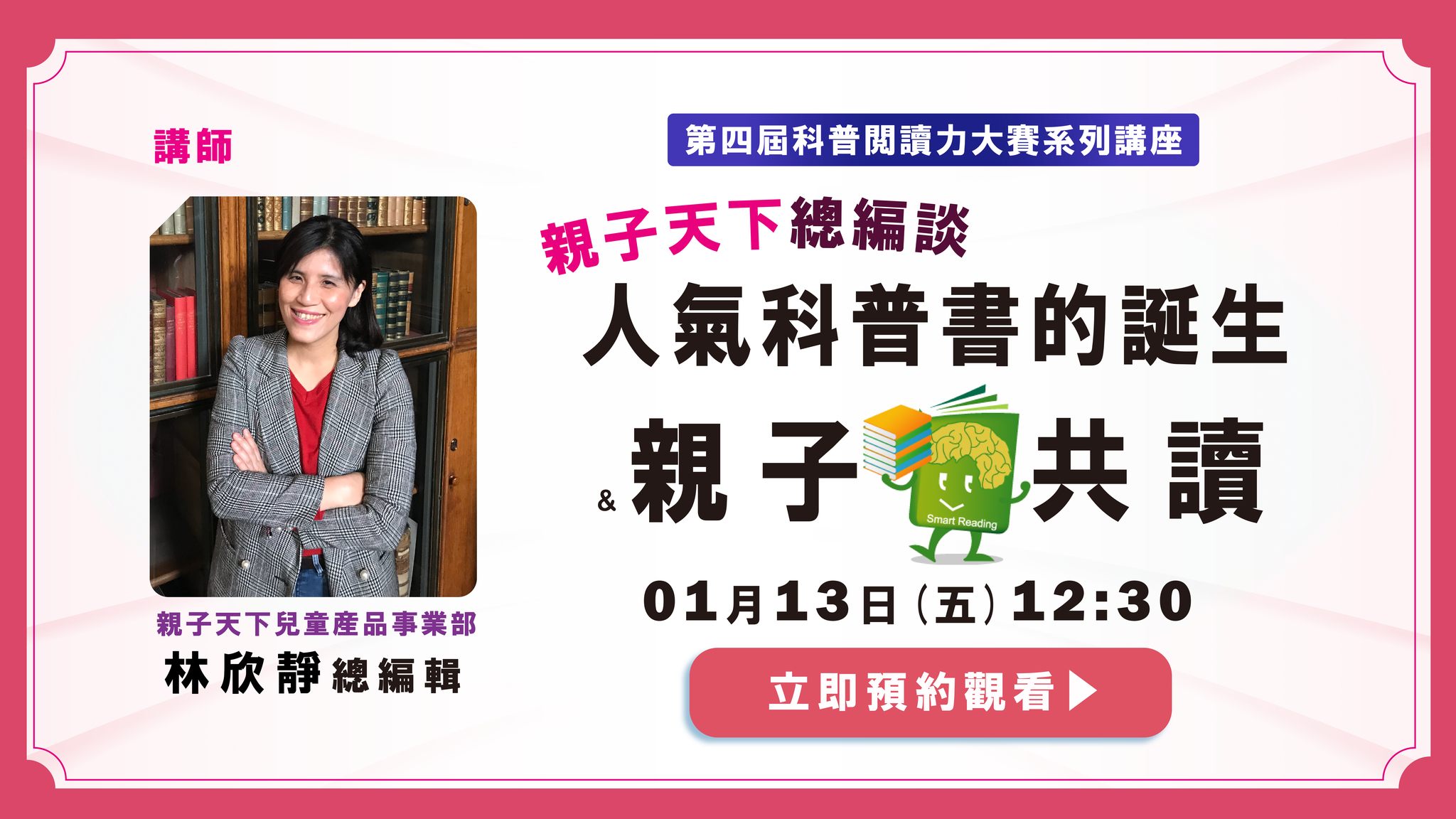 這次邀請到現任親子天下 兒童產品事業部 林欣靜總編輯,來跟我們進行分享人氣科普書的誕生與親子共讀總編輯曾在知名媒體公司從事多年新聞工作,及執行過多項科學相關領域的深度報導當媽媽後轉戰童書領域,目前於親子天下負責全童書的產品...